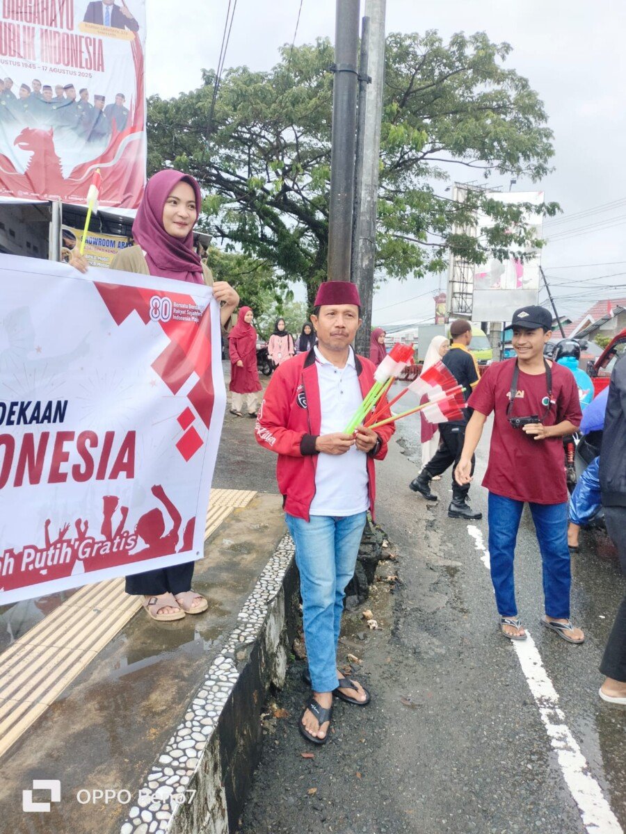 Kegiatan berlangsung tertib dan penuh semangat, meskipun diguyur hujan dan diiringi sapaan ramah kepada pengendara serta ajakan untuk selalu mengibarkan bendera di rumah masing-masing.